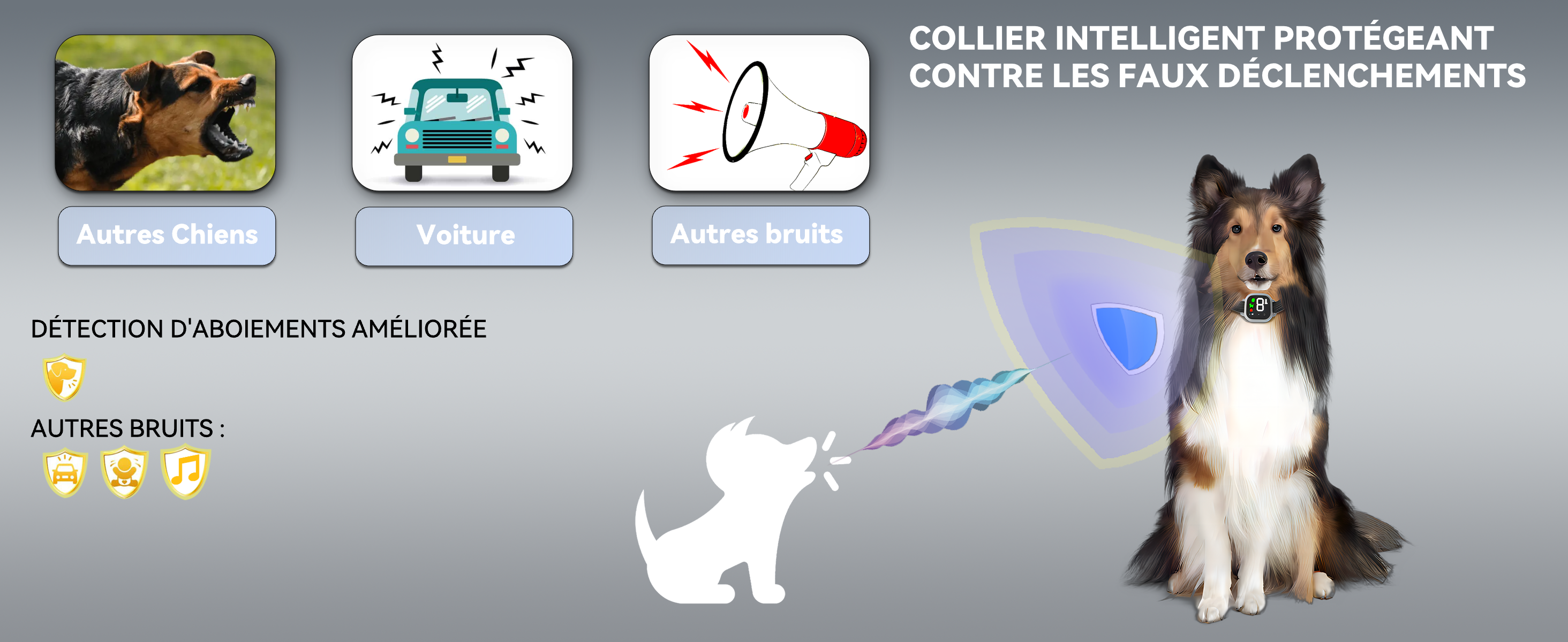 • Puce de détection intelligente d’aboiements:Le capteur de déclenchement intégré à ce collier détectera tous les bruits, puis filtrera uniquement les aboiements pour se déclencher (fréquences d’aboiement : 1000-2000kHZ, 80-90db).Le collier ne s’activera que lorsque votre chien aboie,ce qui vous permettra de le dresser correctement.
