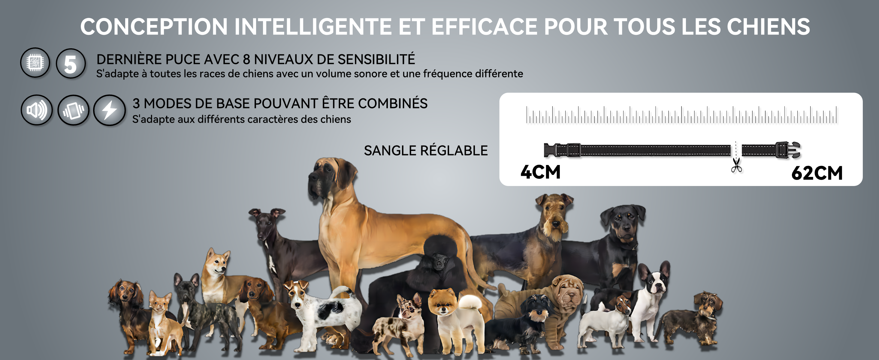 Il est parfait pour les chiens de toutes formes, tailles et races. Ce collier peut vous aider à mieux corriger les aboiements excessifs de votre chien. Rendez votre vie plus paisible et économisez votre temps et votre énergie.