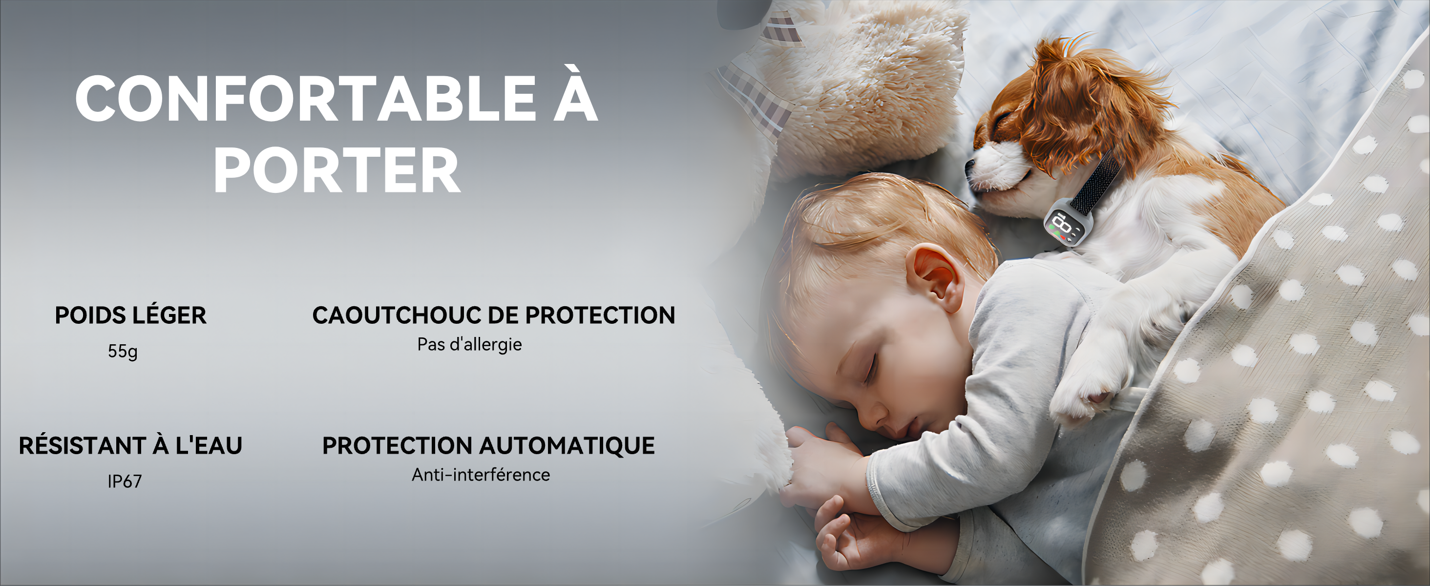 • Système de protection automatique:Si le collier se déclenche plus de 6 fois durant 1 minute, il passera en mode de protection, ce qui le désactivera pendant 1 minutes afin d’assurer la sécurité du chien. Ce mode vise à protéger votre chien et à lui laisser le temps de se calmer.