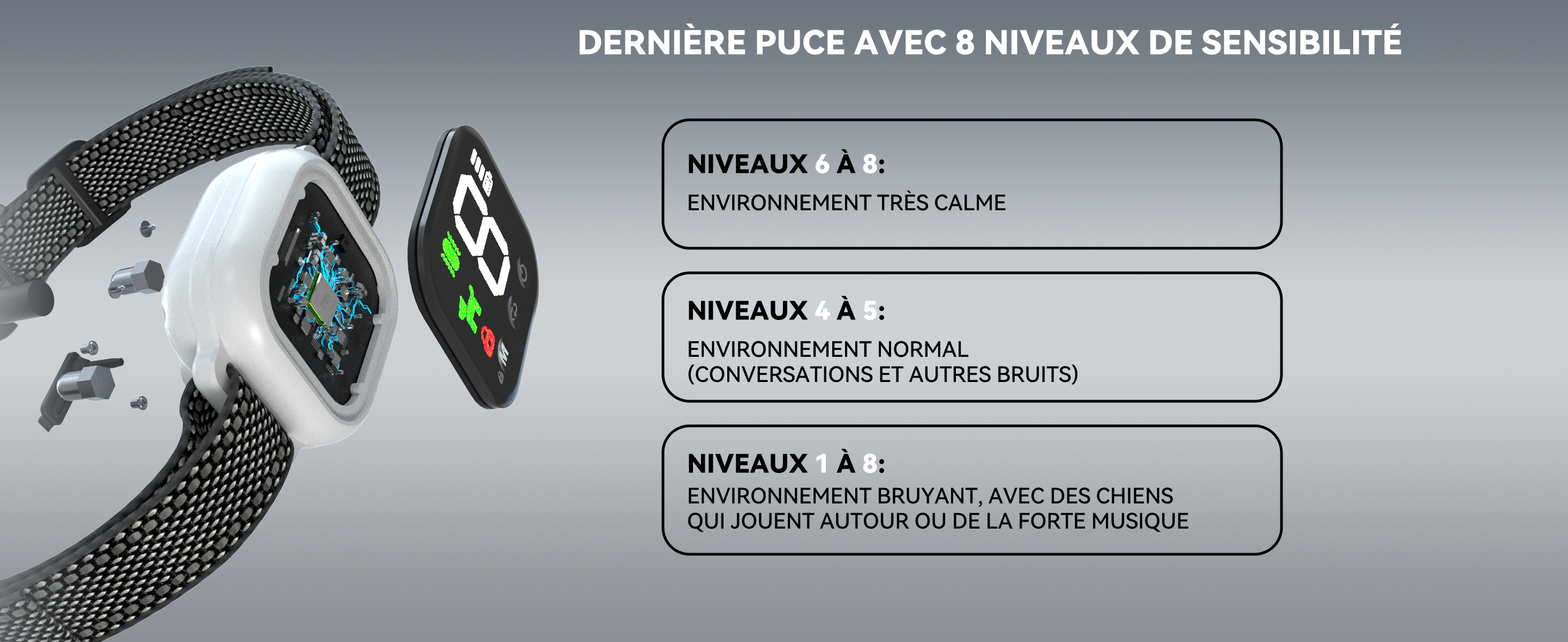 L’environnement, le tempérament et la taille ou la race des chiens peuvent affecter le collier anti-aboiement. Vous trouverez ci-dessous des suggestions pour sélectionner pour le bon niveau de sensibilité en fonction de différents environnements.