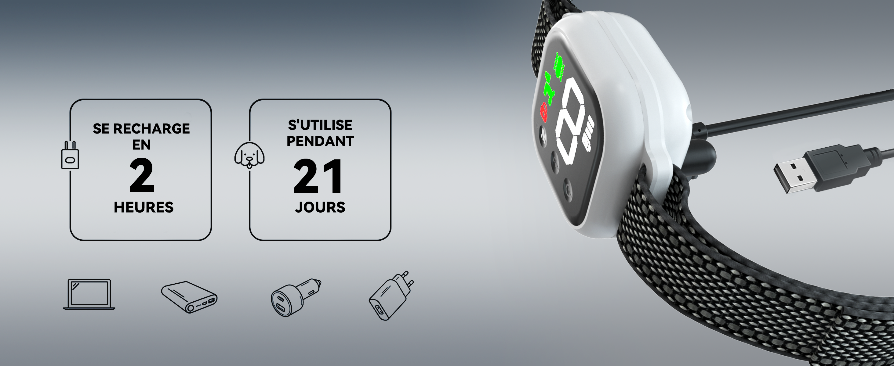 Équipé d'un câble de charge USB, le collier anti-aboiement peut être chargé pendant 2 heures et peut être utilisé pendant 21 jours.
