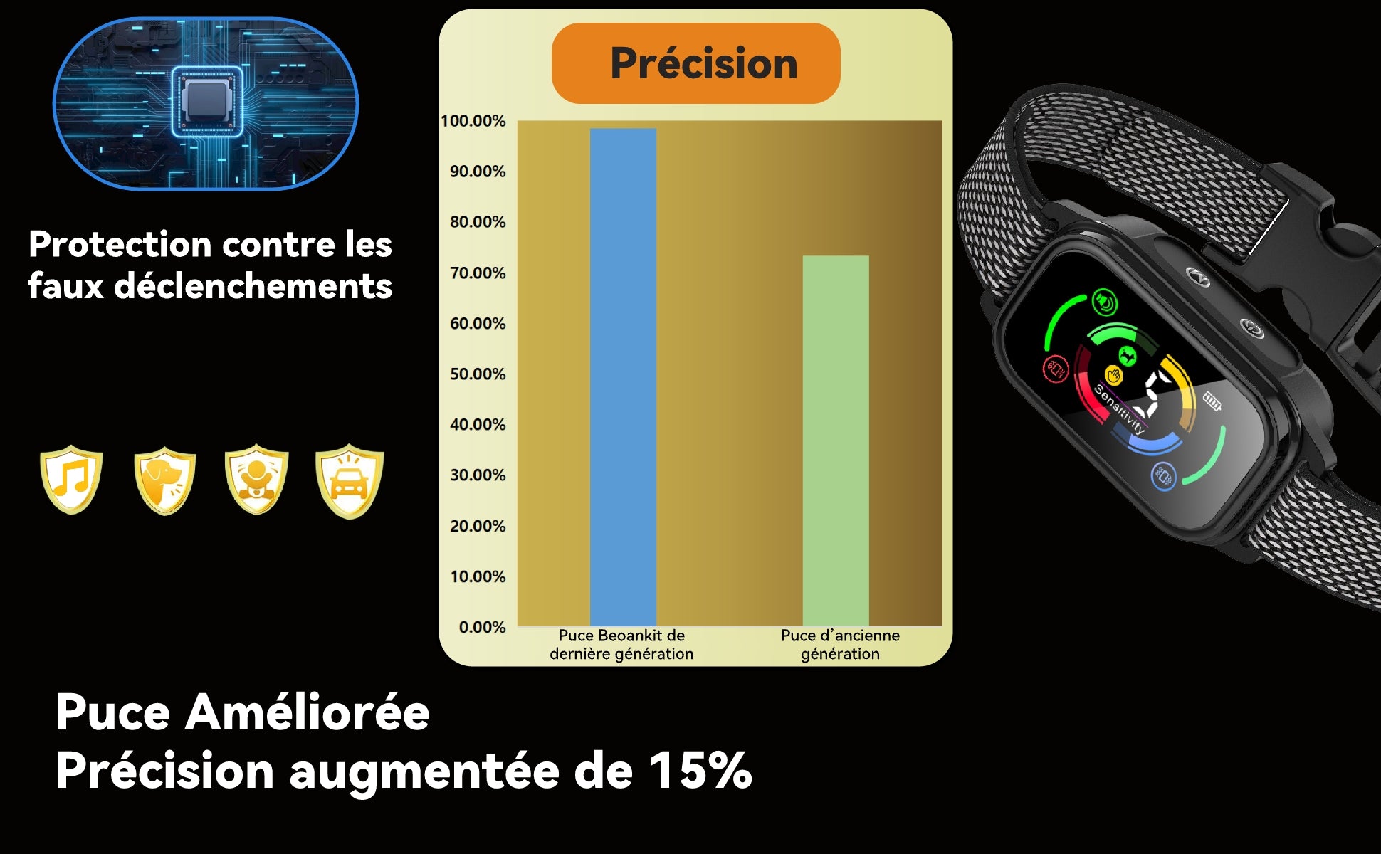 Le collier anti-aboiements intelligent intègre une puce de reconnaissance avancée avec une technologie exclusive de déclenchement. Le capteur de déclenchement intégré à ce collier détectera tous les bruits, puis filtrera uniquement les aboiements pour se déclencher (fréquences d’aboiement : 1000-2000kHZ, 80-90db). Le collier ne s’activera que lorsque votre chien aboie, ce qui vous permettra de le dresser correctement.