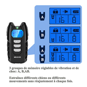 • Conçu pour poils longs et épais, et avec mémorisation des paramètres - Si les poils du chien sont trop longs ou trop épais, les points de contact peuvent ne pas toucher la peau de l’animal. Ces deux pièces de contact métalliques sont montées sur le récepteur pour obtenir un bon résultat au dressage. 3 boutons mémoires pour les vibrations et les chocs statiques : A, B, AB. Dressez différents chiens ou mouvements différents sans régler la télécommande.